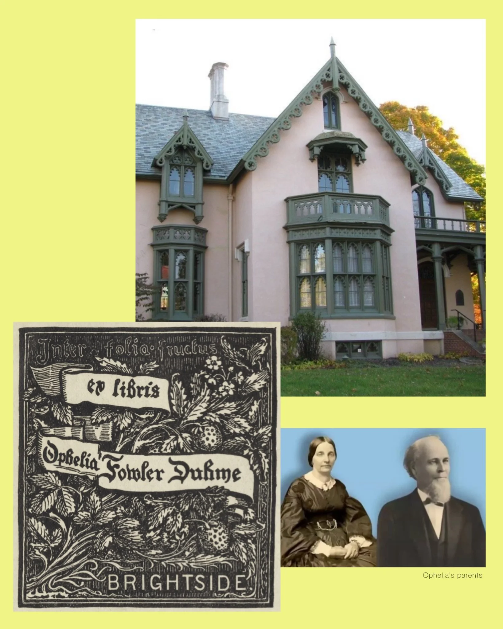 A spite house in honor of Ophelia Fowler Duhme. Born in 1854 in West Lafayette, Indiana, Ophelia was the daughter of Moses and Eliza Fowler of the Fowler Estate (built in 1852). There are, unfortunately, no photographs of Ophelia—only written traces of her life. She died in Ohio in 1921, disowned by her mother and cut out of her inheritance. Eliza disapproved of her daughter’s “playboy” lifestyle and shifted the family fortune to her son James and his heirs.